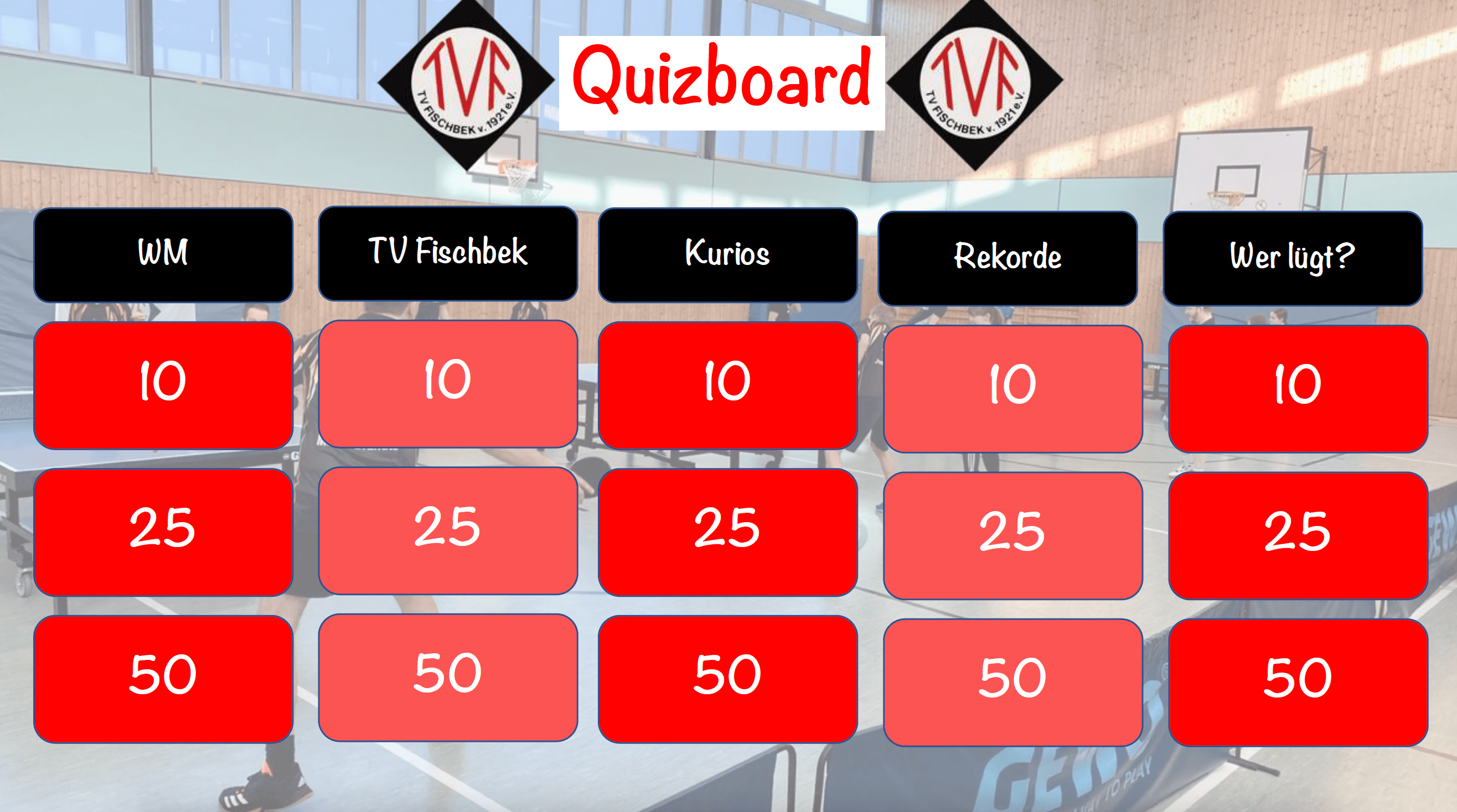 Die guten Ideen von Niclas und Robin reißen nicht ab und so kann ich kurz vor dem Jahreswechsel von einem weiteren Highlight berichten. Heute Nachmittag fanden sich viele Spielerinnen und Spieler aus unseren Reihen virtuell zusammen, um in Gruppen aufgeteilt gemeinsam auf Quizjagd zu gehen. Der Aktion vorausgegangen waren nicht nur intensive Recherchen für geeignete Fragen seitens der Trainer, sondern auch ausgiebige Techniktests, um unseren Superbrains schließlich stolz ein Quizboard mit fünf verschiedenen Kategorien vorzusetzen. Wo liegt der Weltrekord im Tischtennisball-Weitspucken, warum musste das WM-Finale im Damendoppel 1974 unterbrochen werden, wie hat sich der TTR-Wert unserer Abteilung im Jahr 2020 im Schnitt entwickelt - diese und weitere Fragen gehören natürlich zum absoluten Allgemeinwissen und haben unsere Teams vor wenig Probleme gestellt. Ein spaßiger Nachmittag, vielen Dank an unsere beiden Initiatoren!