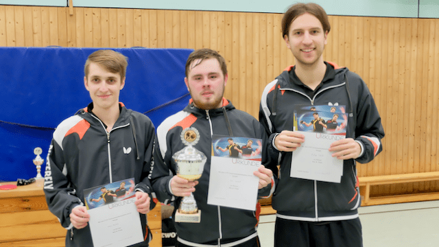 Morris setzte auf seine sehr platzierten Blocks und Angriffsschläge, um sich gegen Robins Topspin Angriffe zu wehren und das durchaus mit Erfolg. Der erste Satz ging knapp an ihn, den zweiten konnte Robin dafür für sich verbuchen. Entscheidend war vielleicht, dass Robin dann den dritten Satz, nachdem beide mehrere Satzbälle hatten, mit 17:15 gewann. Im vierten Satz konnte Robin dann Morris immer mit ein bis zwei Punkten auf Abstand halten und schaffte damit die Titelverteidigung. Glückwunsch Robin, Glückwunsch Morris.